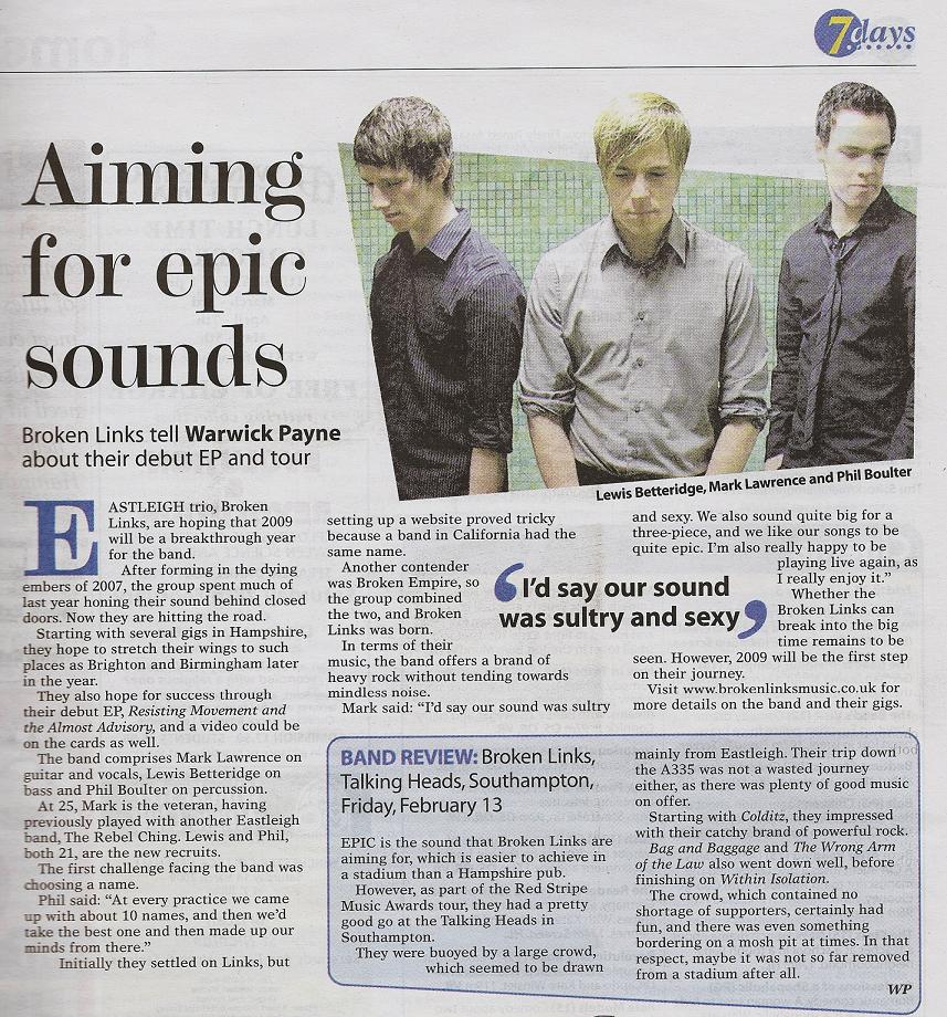 “EPIC is the sound that Broken Links are aiming for, which is easier to achieve in a stadium than a Hampshire pub. However, as part of the Red Stripe Music Awards Tour, they had a pretty good go at The Talking Heads in Southampton. They were buoyed by a large crowd, which seem to be drawn mainly from Eastleigh. Their trip down the A335 was not a wasted journey either, as their was plenty of good music on offer starting with Colditz, they impress with their catchy brand of powerful rock. Bag and Baggage and The Wrong Arm Of The Law also went down well, before finishing on Within Isolation. The crowd, which contained no shortage of supporters, certainly had fun, and their was even something bordering on a mosh pit at times. In that respect, maybe it was not so far removed from a stadium after all."
