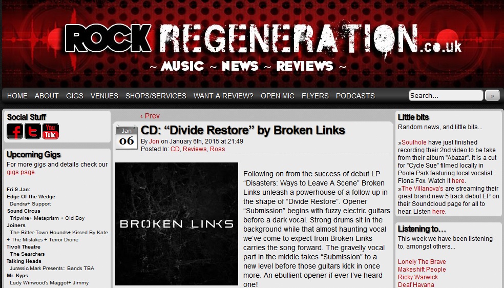 “What You Want” stays in the dark and brooding camp. It has a catchy drumbeat almost throughout. The vocals however remind me of Mansun’s “Paul Draper”. At nearly 7 minutes I’m once again gonna suggest it’s overlong, but who am I to judge?! It’s still a great addition to this collection. The album ends with “Unnatural”. Opening with another Therapy?-esque guitar part, the vocals also have elements of one A.J. Cairns. It’s slow, melodic and once again slightly haunting. As the song expands somewhat the almost ever-present Gahan influence shines through. It chugs along at a slow pace with its big power drums and chiming guitars. The ending fades to nothing and one imagines it’s the perfect ‘set closer’ live. With album number 3 already in the pipeline and a promised bigger sound, Broken Links stock can only be rising. If this collection is anything to go by then the future is very bright indeed. A truly fine body of work." Read Original Review on Rock Regeneration